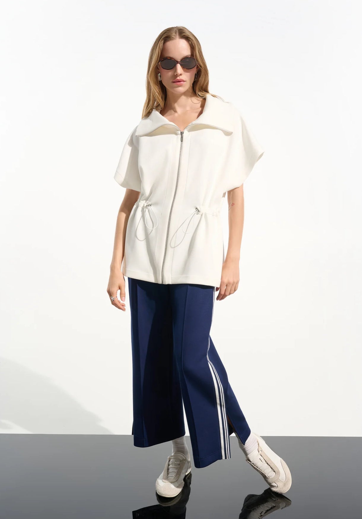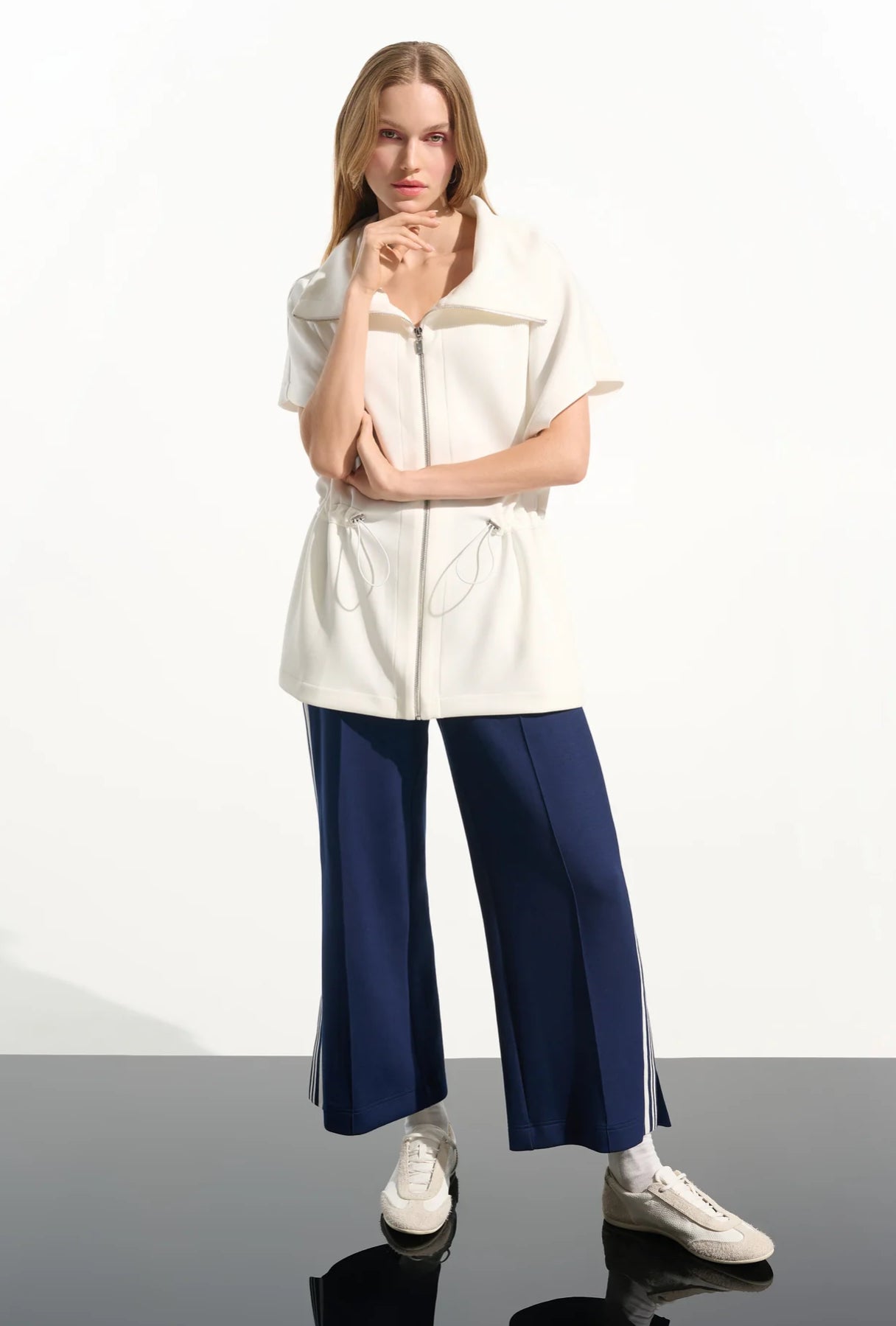 This JOSEPH RIBKOFF JACKET is expertly crafted in Canada with 55% Viscose Rayon, 40% Polyester, and 5% Spandex. The toggle waist and short sleeves provide both style and comfort. Elevate your wardrobe with this timeless jacket.