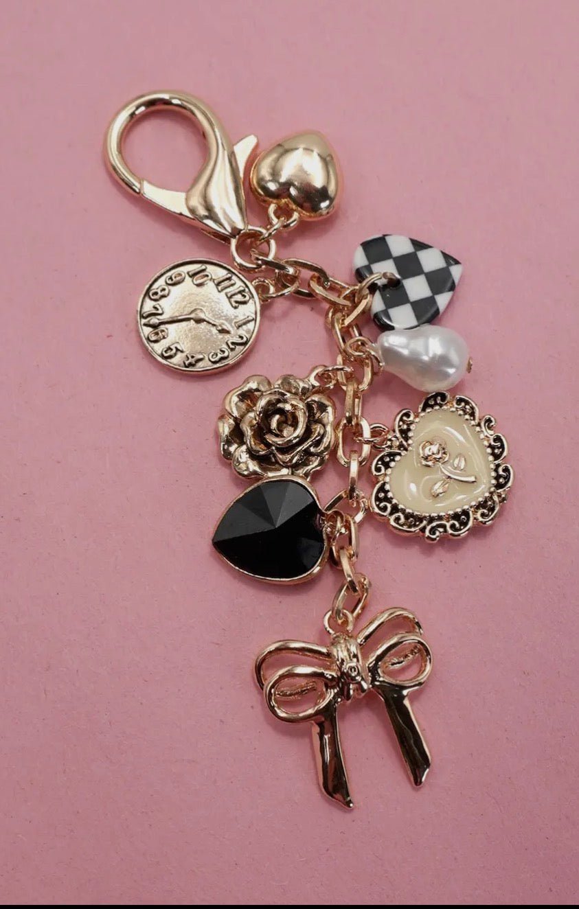 Bow Checker Heart Flower Bag Charm, featuring a stylish checkered heart, a bow and floral accents. This versatile charm instantly upgrades your handbag, backpack, or keyring in any occasions. Perfect gift for the holidays, including Christmas, Mother's Day, Valentine's Day, Easter.
