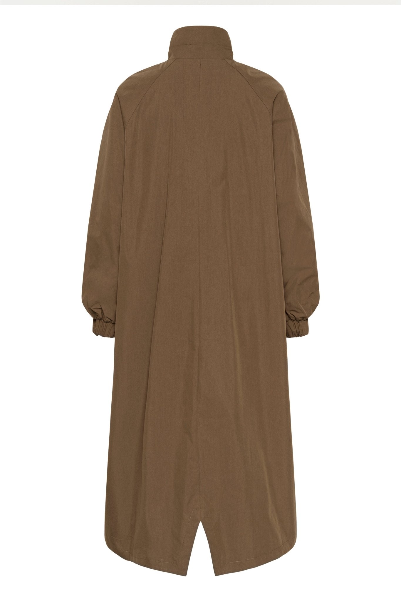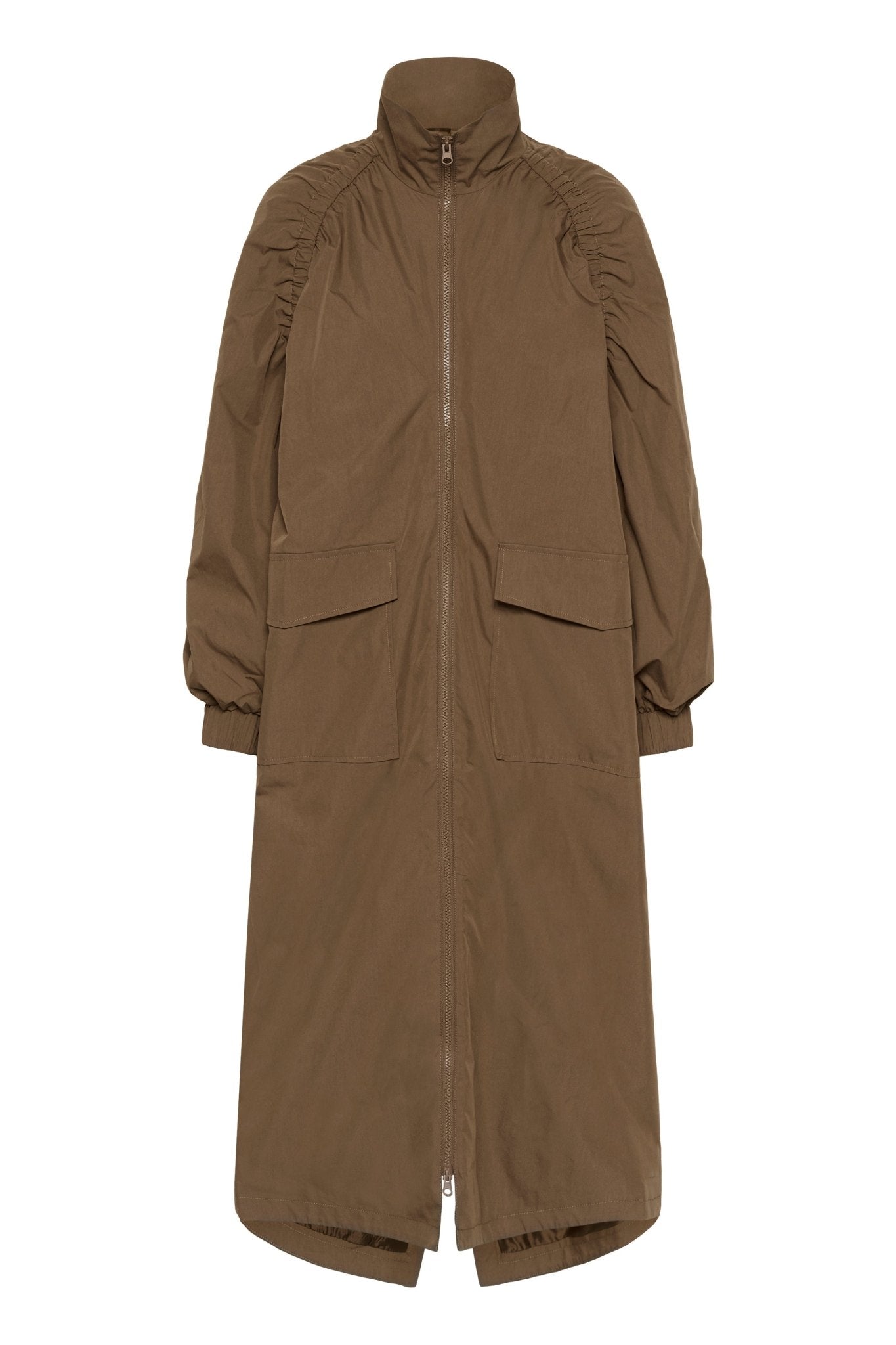 The Conelie Coat in Cub color is a lightweight long coat designed with side ruching for an elegant silhouette. Comprising 65% cotton and 35% polyamide, it offers breathability and comfort while ensuring durability. This coat is suitable for transitional weather, making it a versatile addition to any wardrobe.