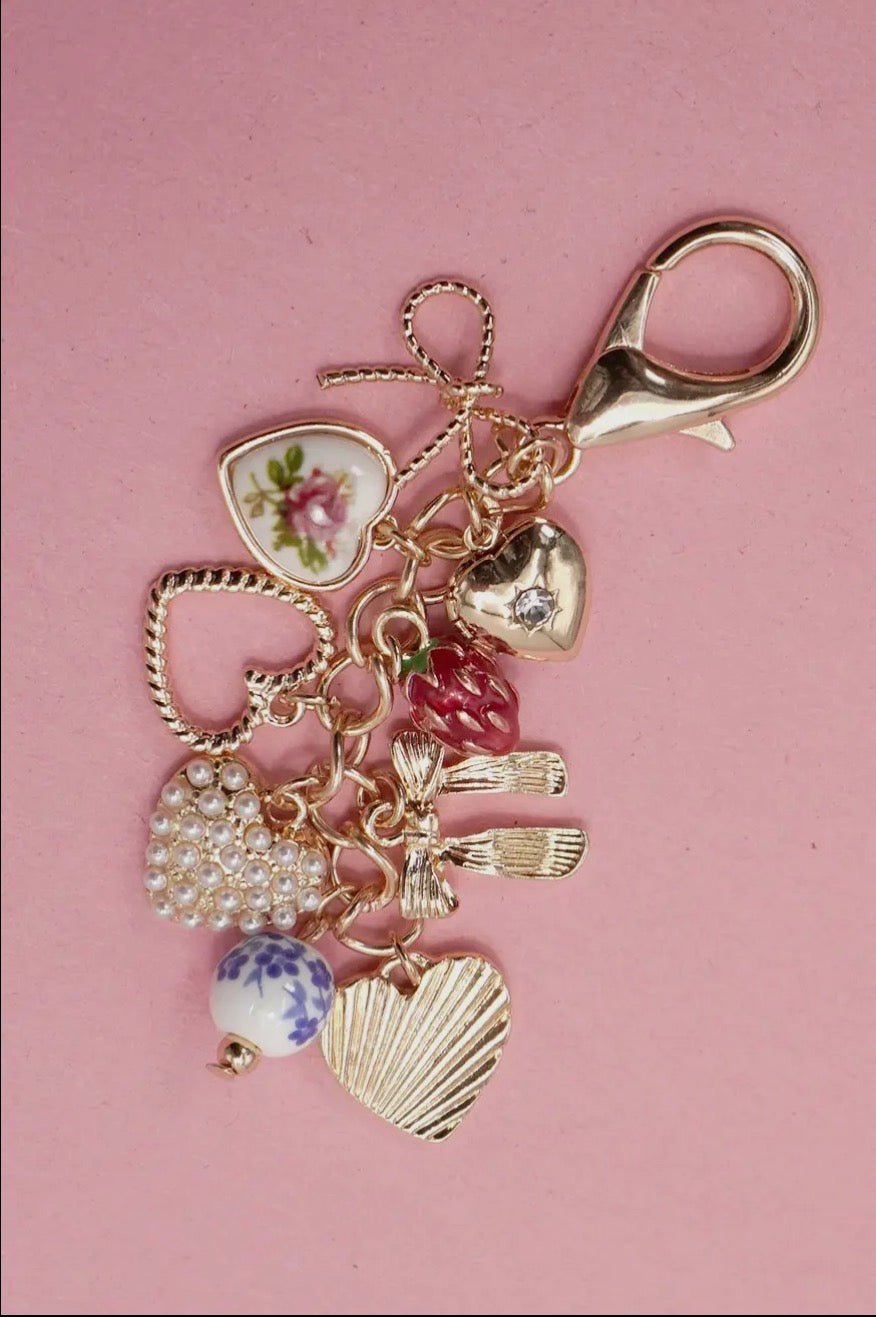 Porcelain Bows Hearts Pearl Strawberry Bag Charm, featuring a delightful mix of porcelain toile pattern bows, heart accents, lustrous pearls, and a sweet strawberry charm, this accessory brings a whimsical yet sophisticated flair to your favorite handbag or keys. Designed with intricate details and a luxurious finish, this bag charm is perfect for those who love a blend of vintage elegance and playful charm. Clip it onto your tote, purse, or backpack for an instant style upgrade.