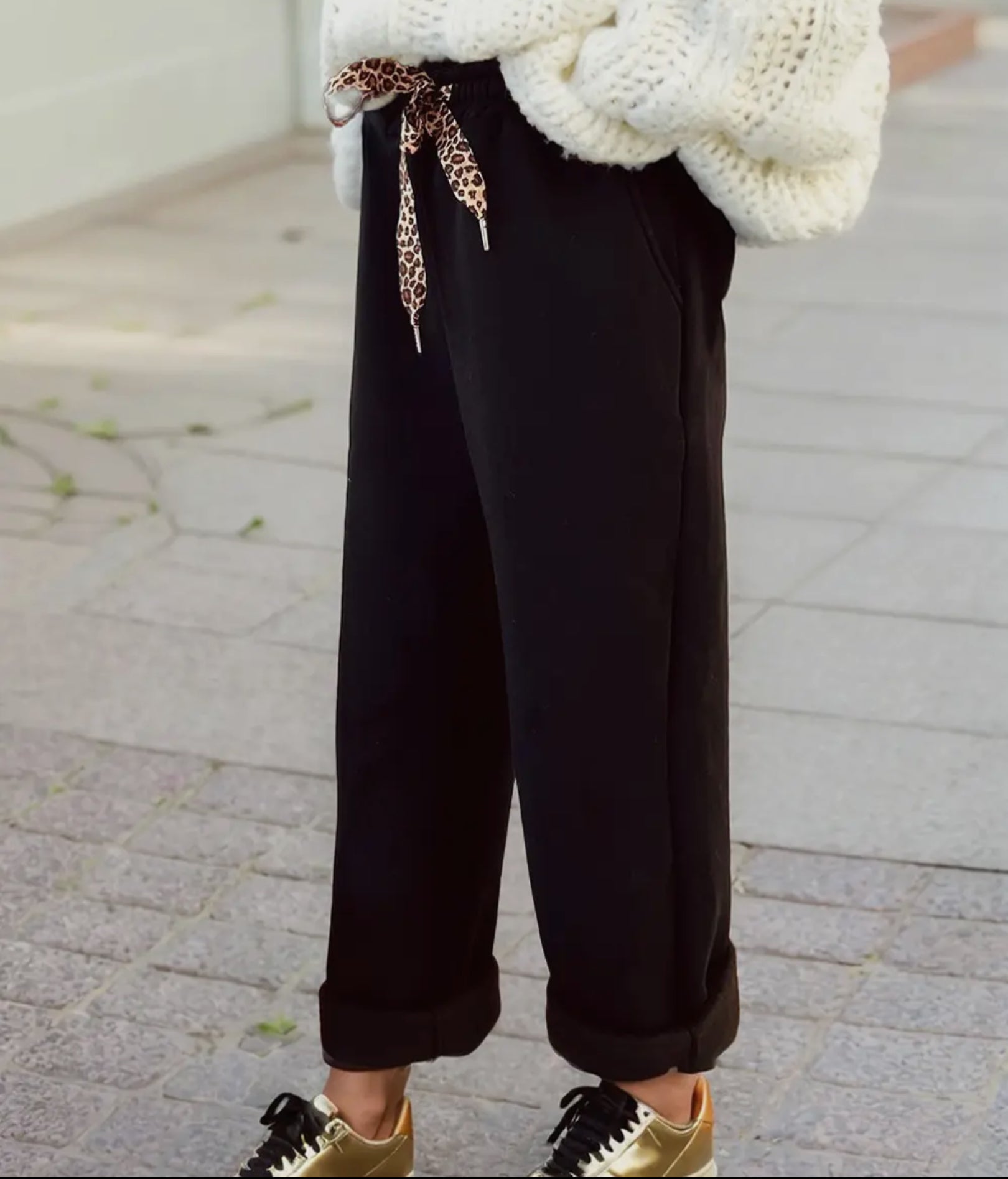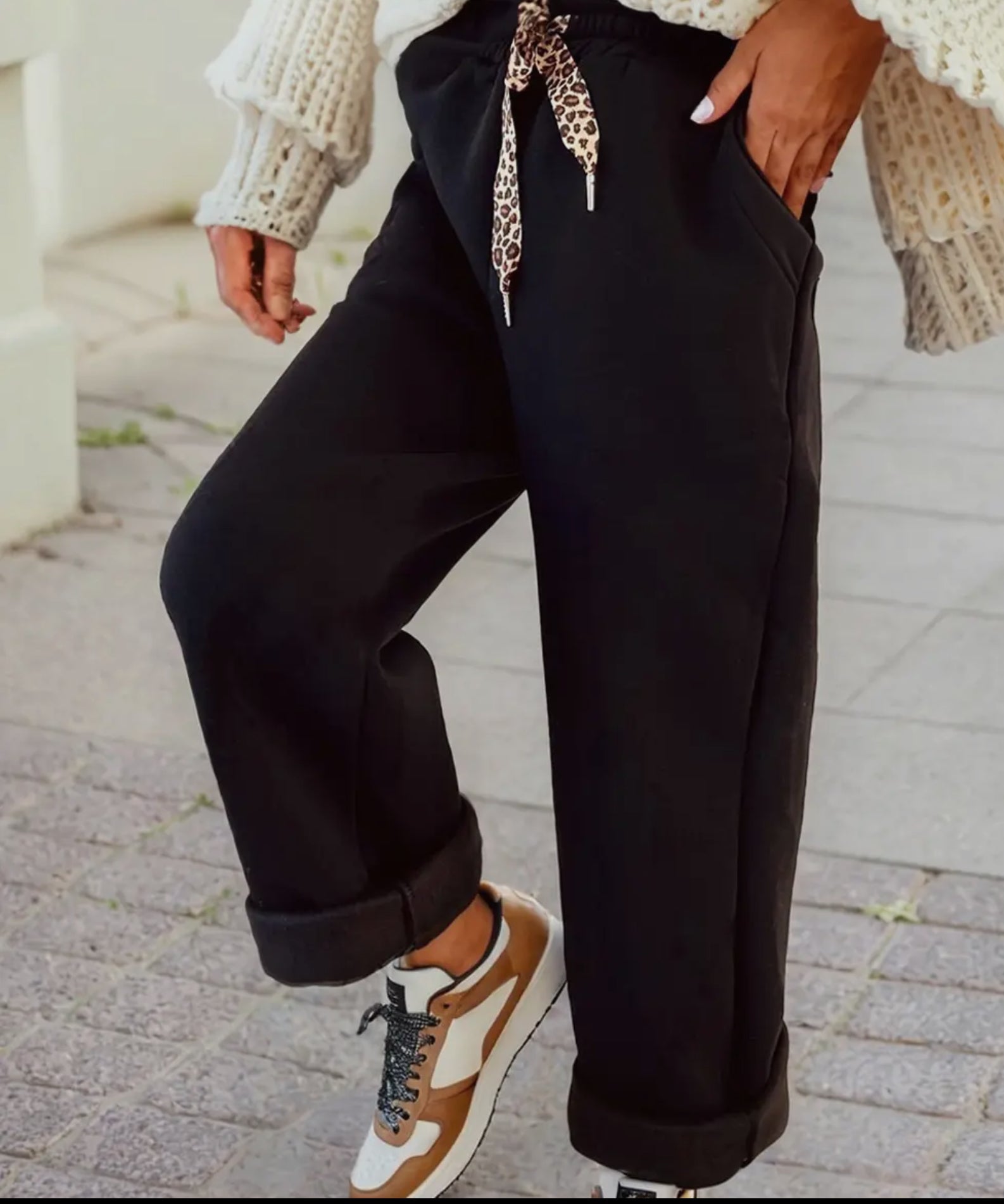 "Stay warm and stylish fleece lined pants with leopard drawstring. Made with a 50% polyester and 50% cotton blend, these pants are both comfortable and durable. The drawstring elastic waist ensures a perfect fit, while the solid color and leopard print design add a touch of fashion to any outfit.