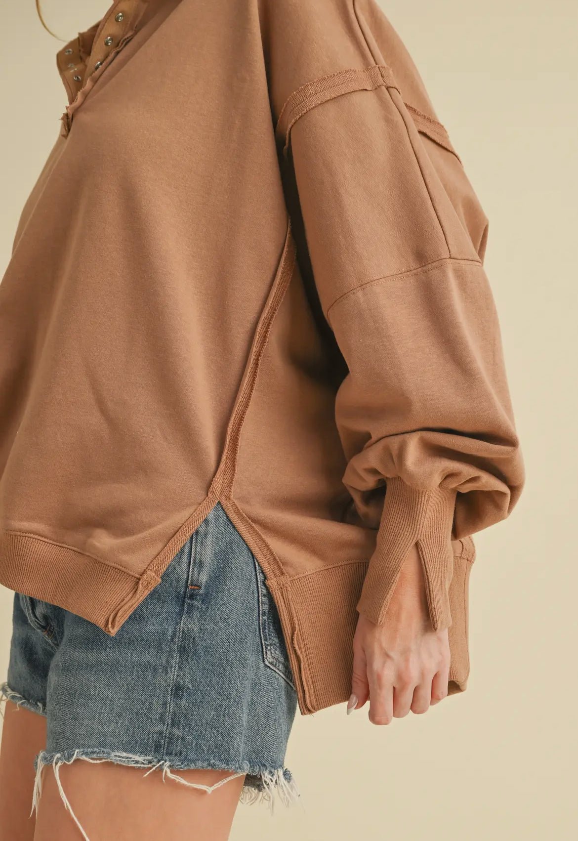 Crafted from French Terry, it is perfect for layering over biker shorts or leggings, and it’s the ultimate blend of sporty and cozy chic. This bold oversized Henley sweatshirt pullover in mocha features snap details at the neckline and a relaxed silhouette for effortless athleisure style.