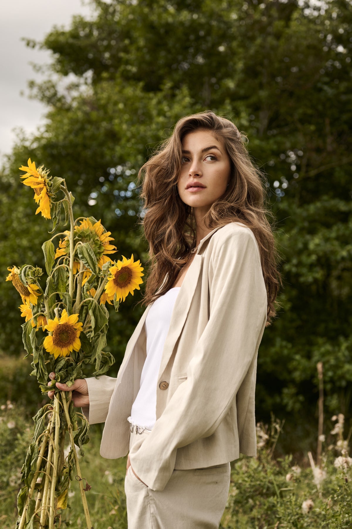 The June Blazer by Cream is crafted with a blend of 52% linen, 45% viscose, and 3% elastane, offering a breathable, comfortable fit. The linen content promotes moisture-wicking properties, while the viscose enhances softness and drape. The slight elastane provides flexibility, ensuring ease of movement.