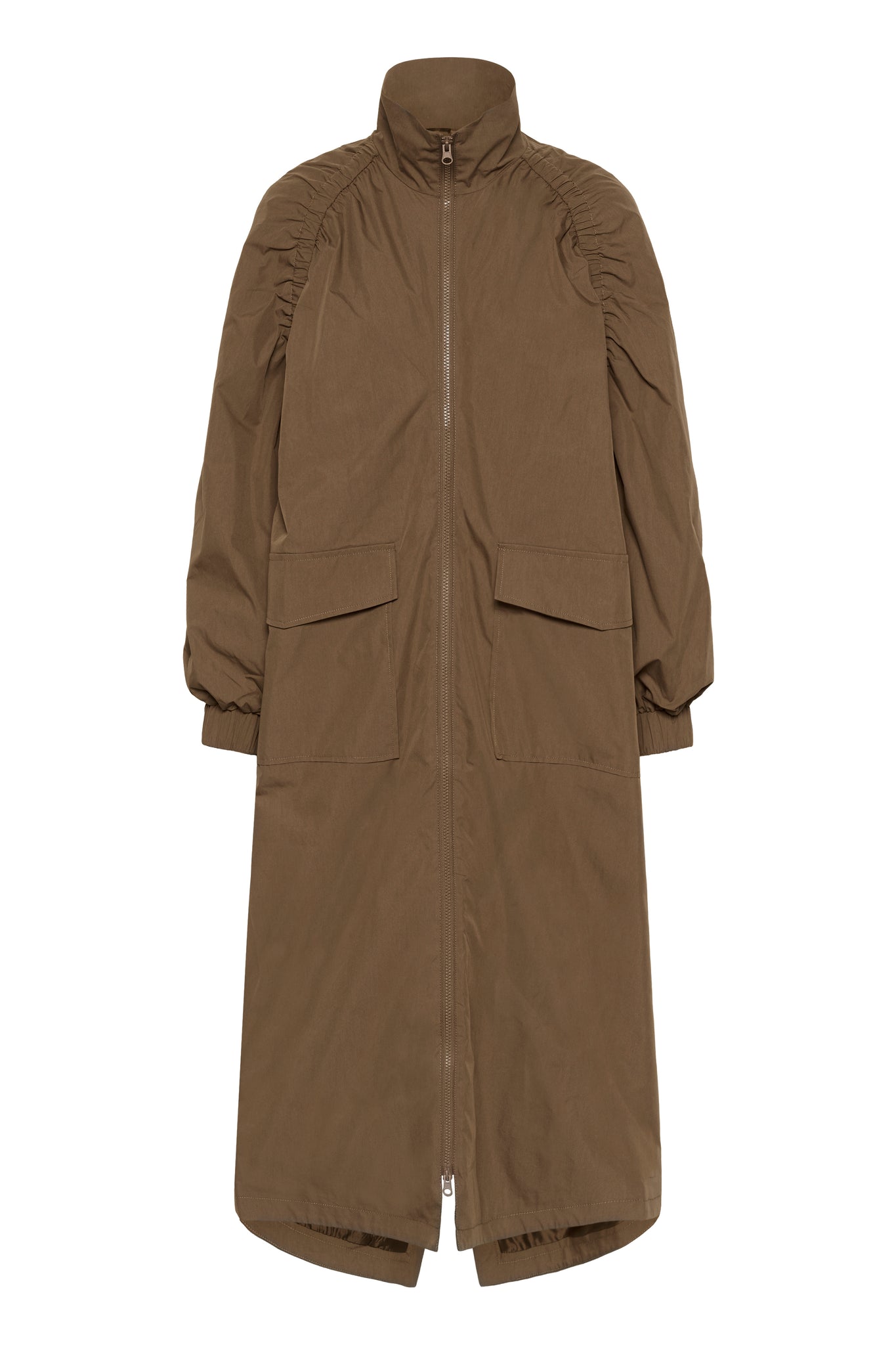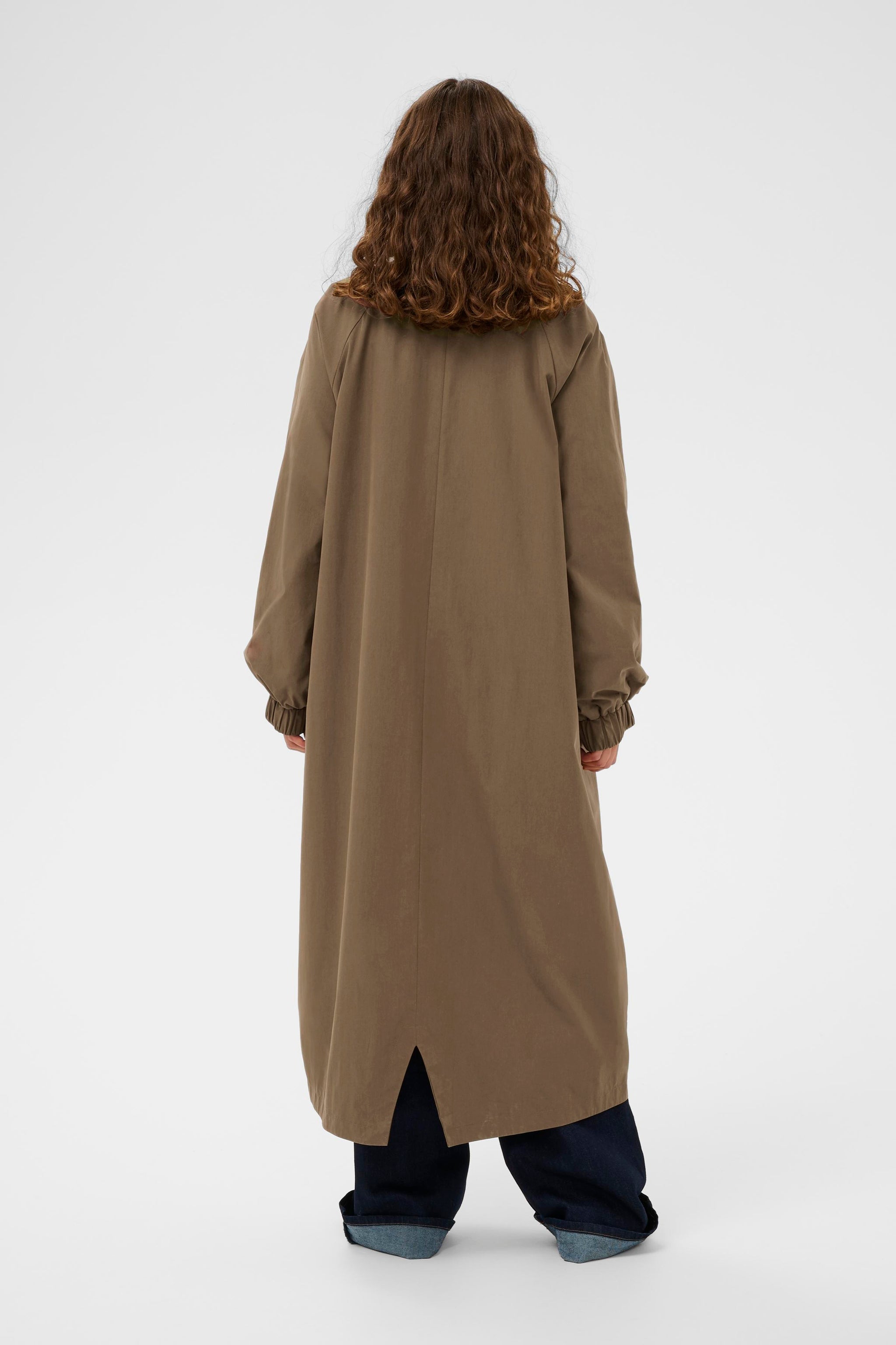 The Conelie Coat in Cub color is a lightweight long coat designed with side ruching for an elegant silhouette. Comprising 65% cotton and 35% polyamide, it offers breathability and comfort while ensuring durability. This coat is suitable for transitional weather, making it a versatile addition to any wardrobe.