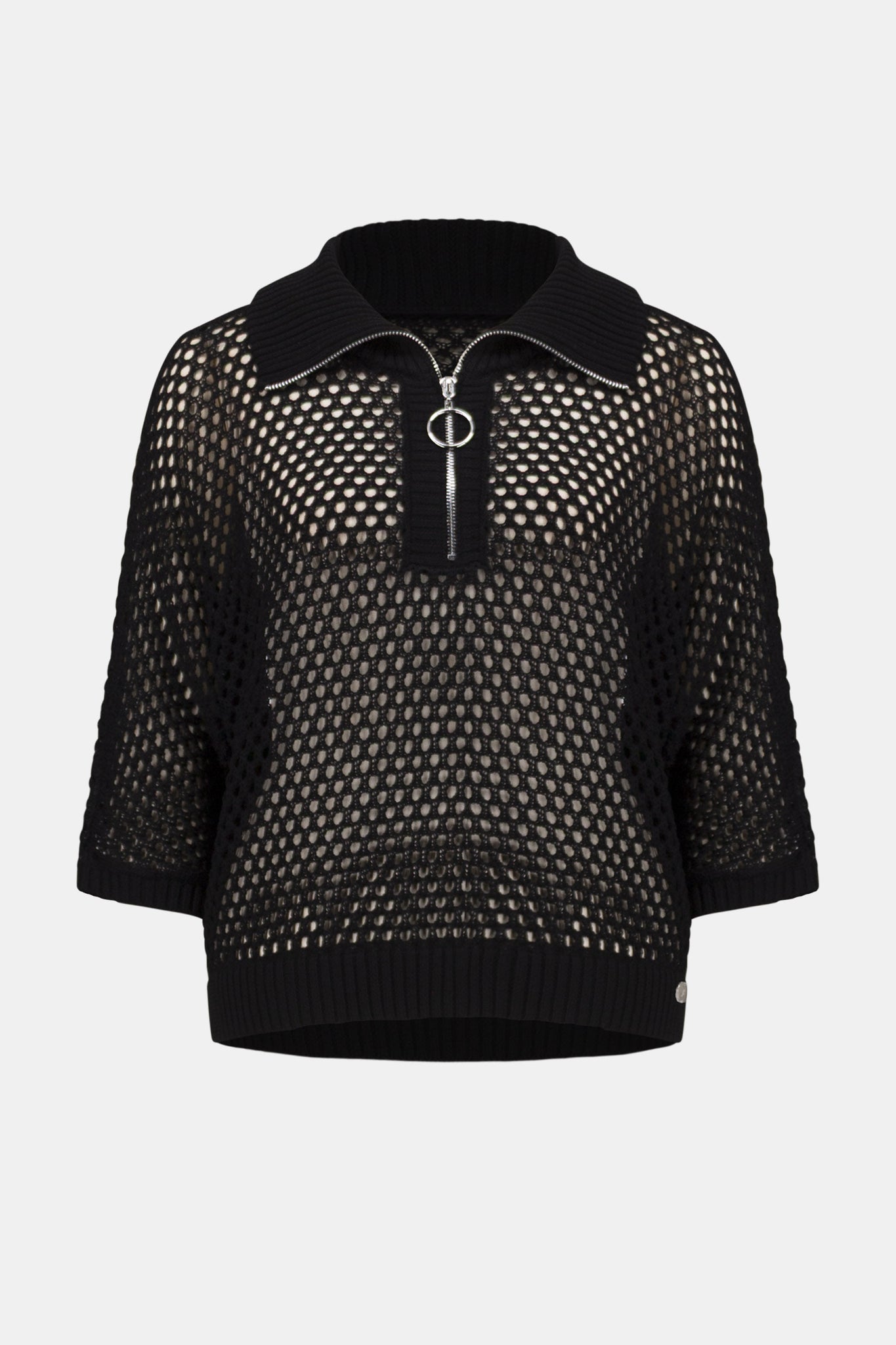 Vicscose Blend Boxy Sweater Knit With Zipped Neckline in Black 261634